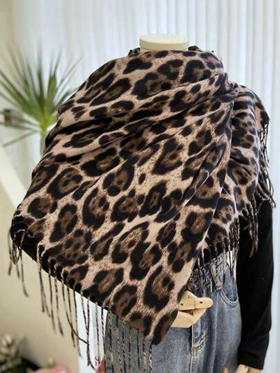 FADZOYLE 1 件卡其色女士冬季长款豹纹围巾温暖柔软毛毯围巾适合晚礼服派对旅行办公室秋季婚礼和礼物羊绒手感大号超大号彩色图案流苏披肩和围巾优雅 - 卡其色 - 查看 1