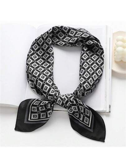 1 件女士仿丝印花 70 厘米方形围巾,时尚简约头巾风格围巾,适合商务会议、休闲旅行、节日和派对 - 黑色 - 查看 1