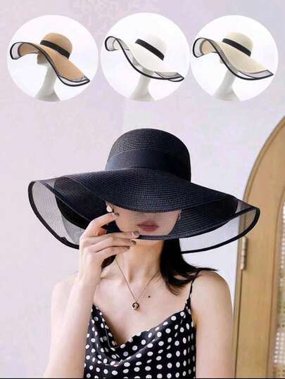 1顶大檐遮脸帽 优雅欧根纱渔夫帽 女款夏季薄款遮阳防晒草帽 万圣节、海滩、度假