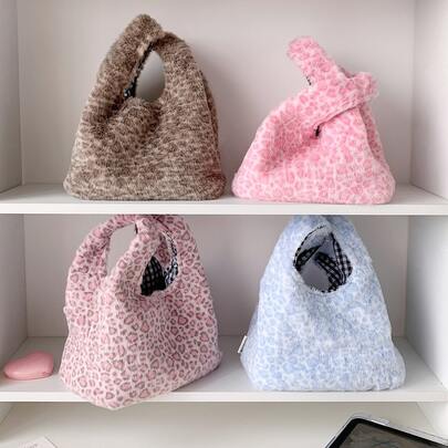 1个豹纹毛绒手提包,女士款,柔软蓬松便携,适合学生,可爱购物手提包,日常出行必备,多功能收纳袋,轻便化妆包,带提手,可装洗漱用品、文具和小物件,非常适合上学、购物、约会和户外活动。