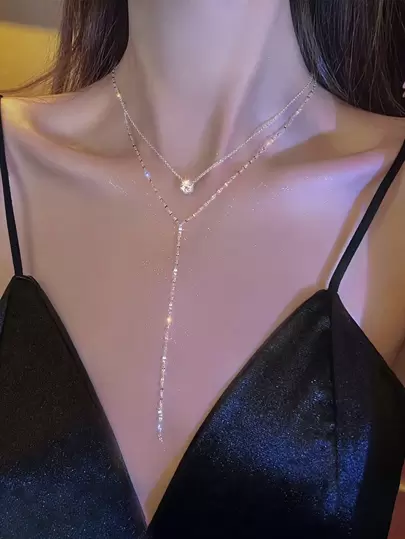 1入奢華的不尋常性感長流蘇和閃閃發光的水晶雙層鎖骨項鍊 - 銀色 - 查看 1