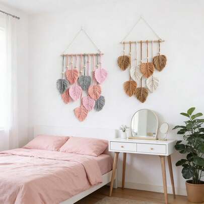 1件套手工编织挂毯,波西米亚风流苏叶子装饰,简约手工编织叶子背景墙挂毯,床头板挂饰 - 彩色 - 查看 10