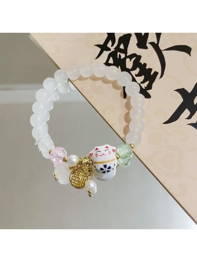 1 件招财猫风格手链,独特的森林元素设计适合女性日常佩戴,是送给家人和朋友的完美礼物 - 陶瓷貓福牌手串 - 查看 1