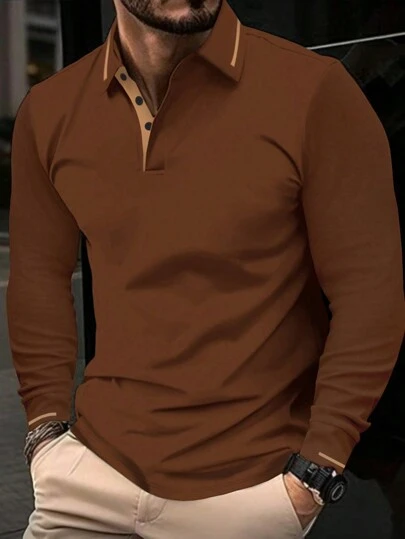 1 件男士休闲四分之一纽扣长袖 Polo 衫,适合春秋季节、高尔夫、秋季 - 咖啡棕 - 查看 8