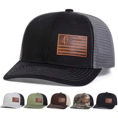 1顶男士美国国旗皮革贴片卡车帽,缝制棒球帽,街头时尚网眼帽,户外防晒休闲帽,适合春季、秋季、旅行、海滩等场合
