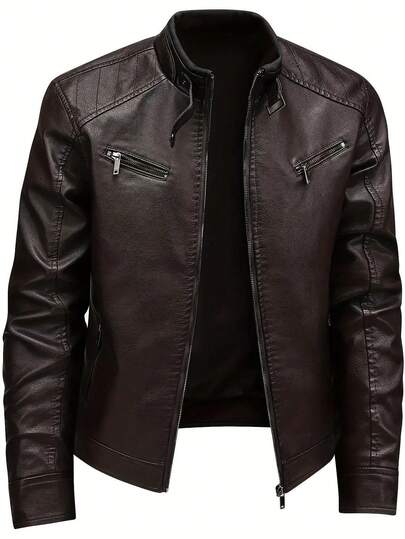 男士夹克,春秋季摩托车夹克,宽松拉链PU皮夹克 - 咖啡棕 - 查看 1