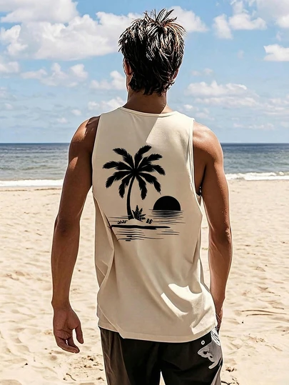1件男士夏季休闲椰树太阳印花圆领背心 - 杏色 - 查看 1