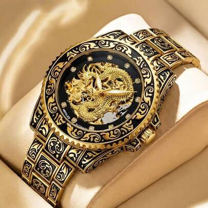 1件男士复古金色钢带高端优雅龙纹雕刻自动机械表,父亲节礼物 - 均碼 - 查看 1