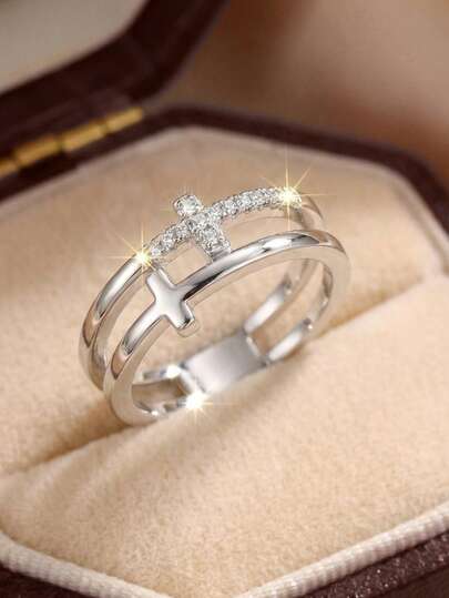 1枚极简设计立方氧化锆镶嵌十字铜双层可叠戴戒指