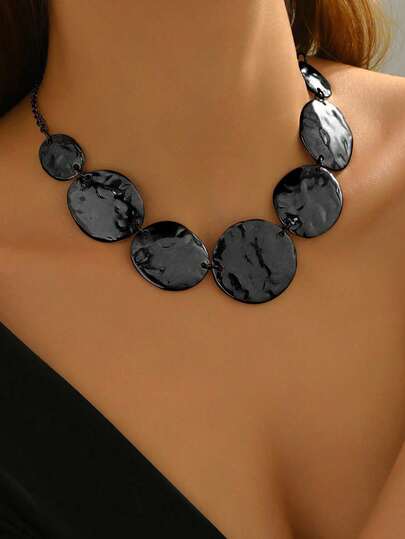 1件简约时尚几何圆形吊坠项链,休闲金属金色颈链 - 黑色 - 查看 1