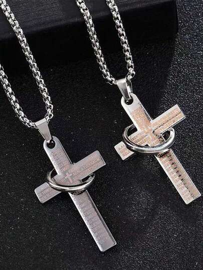 1件极简主义不锈钢嘻哈时尚字母十字圆环/冥想哨吊坠项链,男士朋克项链 - 銀色 - 查看 1
