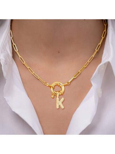 1件新款经典泡泡字母吊坠弹簧扣金色不锈钢回形针链项链,女士款 - 金黃色微鑲氣泡字母 - 查看 1