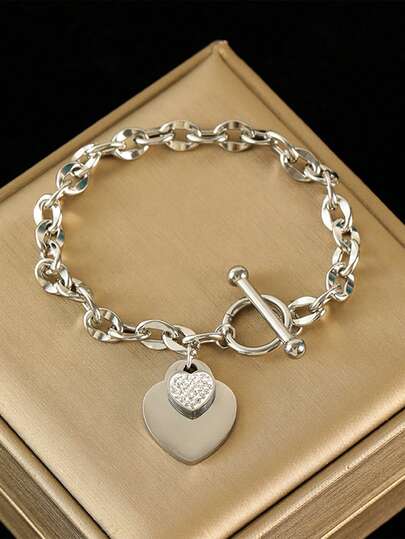 1件新款时尚不锈钢双心手链,女士防水首饰礼品,适合节日佩戴 - 銀色 - 查看 1