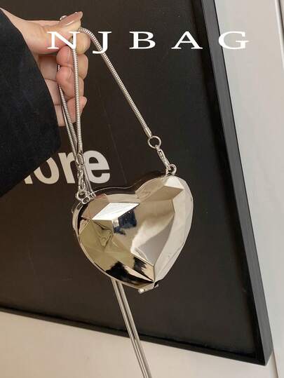 1个新款迷你金属小包,镀银零钱包,闪亮前卫金属心形斜挎包,实用手拿包,配饰包,优雅零钱包,耳机盒,婚礼和情人节 - 銀色 - 查看 1