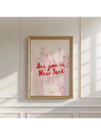 1幅粉色纽约城市景观印刷品:中世纪现代旅行海报,帆布墙画,房间装饰,适用于客厅、卧室、办公室、酒吧墙面装饰,无框 - 彩色 - 查看 1