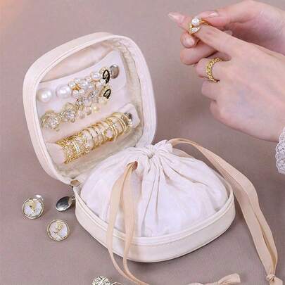 1个便携式PU迷你首饰收纳盒,分层抽绳袋设计,双层拉链隔层,耳环、戒指旅行首饰整理盒