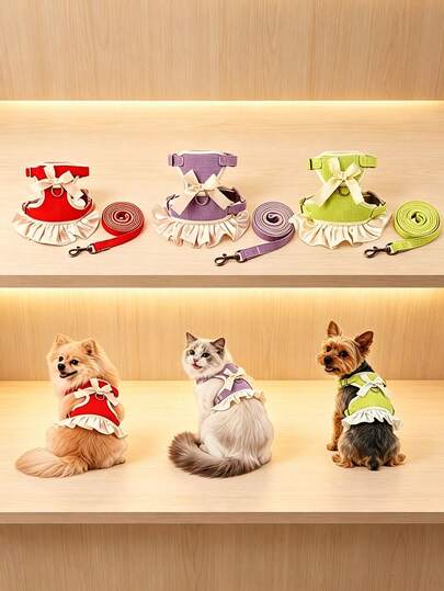 1件装/公主风宠物胸背带,带蝴蝶结和荷叶边装饰 - 透气华夫格面料 - 可调节尺寸 - 适合小型犬和猫