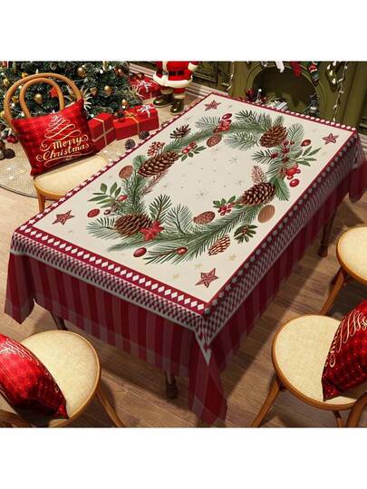 1 块长方形桌布,经典红绿圣诞主题,带有松枝和浆果印花,适合日常家庭聚会、客厅和餐厅、圣诞节活动,耐用涤纶桌布,耐污 - 彩色 - 查看 1