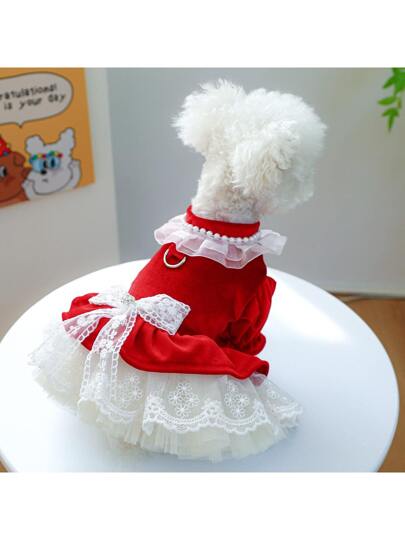 1入組紅色的絲絨&蕾絲洋裝合適的適用於寵物的婚禮穿戴,帶背帶圓環適用於戶外 - 紅色 - 查看 1