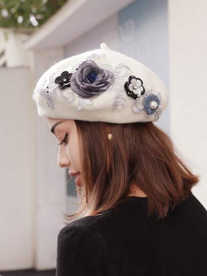 1個簡約復古刺繡3d花紋羊毛貝雷帽,適用於秋冬日常穿著 - 杏色 - 查看 1