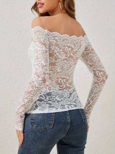 一件纯色蕾丝拼接露背修身优雅上衣,适合日常穿着、约会、度假,四季皆宜,长袖。 - 白色 - 查看 5