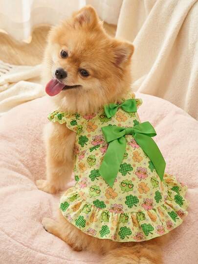 1件圣帕特里克节三叶草印花狗狗连衣裙,双层蝴蝶结袖宠物公主裙,适合小型至中型犬(泰迪犬、博美犬等),作为节日焦点服装! - 彩色 - 查看 1