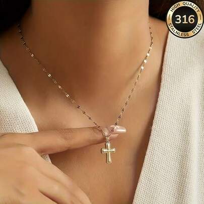 1件不锈钢十字架吊坠项链,经典嘻哈休闲风格,适合万圣节、圣诞节、复活节礼物,百搭日常配饰 - 金色 - 查看 1