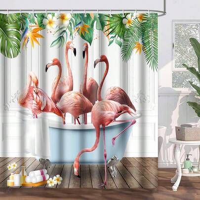 1件装甜美火烈鸟图案浴帘,植物动物印花浴帘,非常适合浴室装饰、通用房间装饰、家居装饰套装、浴室配件浴缸帘 - 彩色 - 查看 1