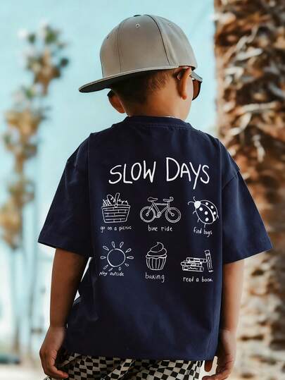 1件装幼儿男童休闲印花圆领短袖T恤,夏季学生装 - 这款印有趣味字母图案的T恤为每个孩子带来欢乐!慢生活 - 藏蓝色 - 查看 1
