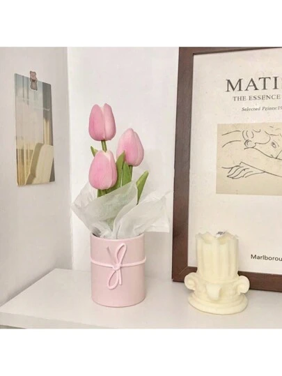 1入組鬱金香人造花束,附塑料桶、產品包裝紙和手提袋,適用於周年慶、情人節、生日和家居裝飾 - 粉色 - 查看 1