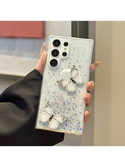 1入情人節禮物白色閃光星星和2只蝴蝶拼貼手機殼,適用於iPhone/Android - 白色 - 查看 1