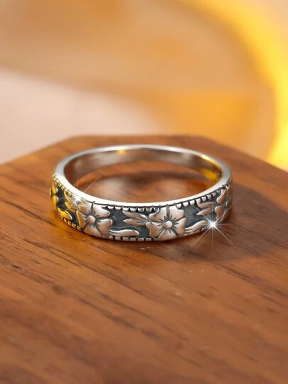 1 件复古精致真银黑色雏菊花戒指,适合女性订婚结婚礼物 - 復古銀色 - 查看 1
