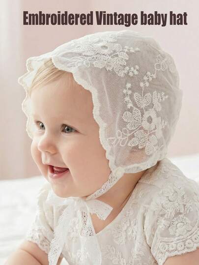1顶复古蕾丝婴儿帽,米色/白色,可作为传家宝洗礼帽和摄影帽,饰有精致刺绣花卉图案,柔软舒适,适合新生女婴,0-3个月,3-10个月。 - 1PC - 查看 7