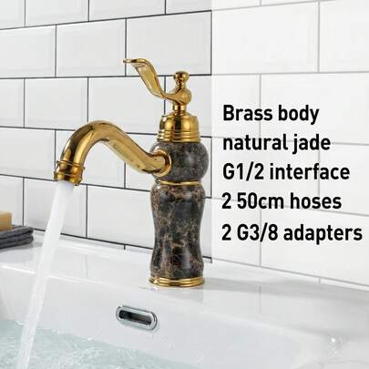 1个复古宫廷风格黄铜棕色大理石饰面浴室水槽龙头,单把手冷热水混合龙头,G1/2进水口,2根50厘米软管,2个G3/8转接头 - 金色 - 查看 1