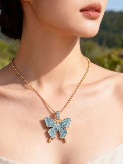 1件复古百搭优雅宫廷风田园甜美低饱和度蝴蝶吊坠项链 - 淺藍色 - 查看 1