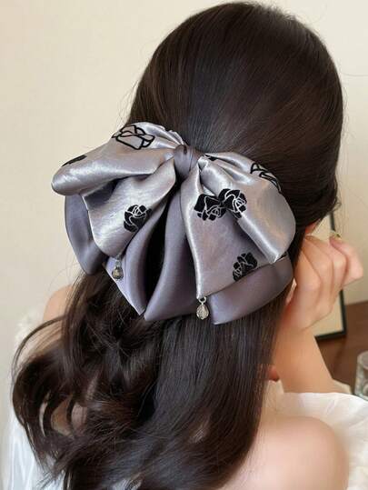 1件装女士时尚蝴蝶结发爪玫瑰印花发爪优雅后脑勺半扎发爪头饰发饰