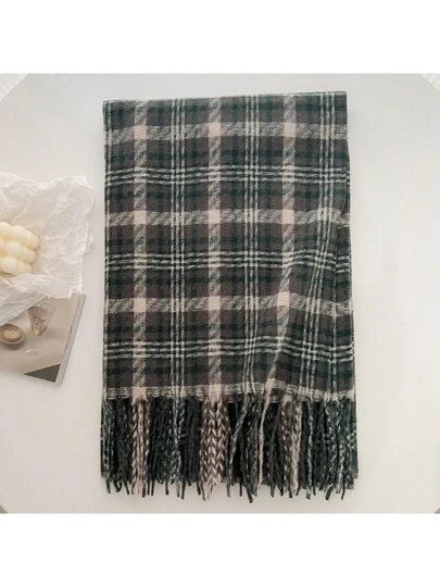 1入女士多色格紋流蘇長款冬季保暖圍巾,適用於戶外活動和日常使用 - 深灰色 - 查看 1