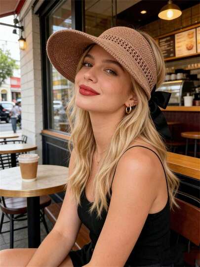 1顶女士草帽,蕾丝边宽檐遮阳帽,UPF防紫外线,可折叠收纳,夏季沙滩旅行波西米亚风蝴蝶结草帽