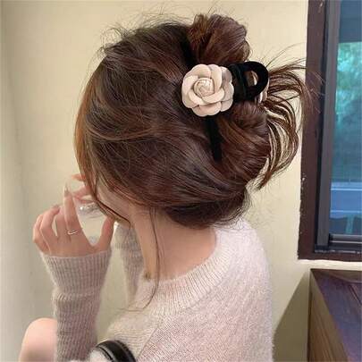 1件女士优雅时尚山茶花大号发夹,马尾发髻爪夹,黑色植绒发饰,适合日常造型,时尚百搭的发饰 - 彩色 - 查看 1