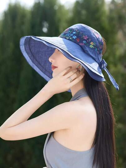 1顶女士大檐花卉蝴蝶结遮阳帽,2026新款防晒宽檐渔夫帽