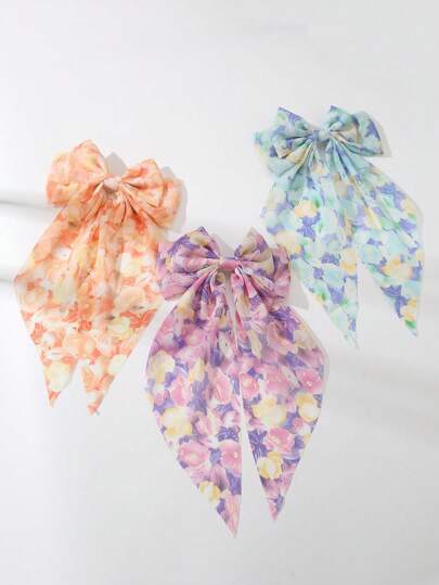 1件女士简约优雅橙色、紫色、蓝色花卉印花丝带蝴蝶结发夹,百搭春夏配饰 - 彩色 - 查看 1