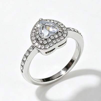 1枚女士银色心形锆石戒指,心形设计时尚首饰,百搭戒指,情人节礼物