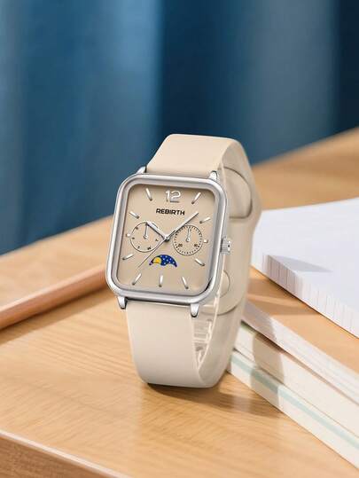 1 件女士方形简约时尚硅胶表带石英手表,适合日常佩戴 - 米色 - 查看 1