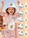 2件套儿童彩色向日葵字母图案遮阳帽,26个字母可定制,复古艺术清新多功能轻便防晒渔夫帽,小巧便携,适合5-10岁男孩女孩日常、上学、户外活动佩戴,生日和节日送礼佳品。