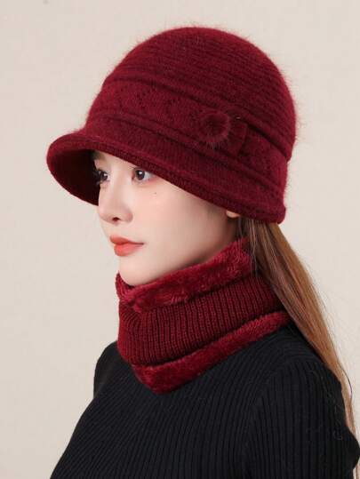 1套(1入帽子+1入圍巾)女性針織帽子和圍巾套裝,秋冬保暖套裝,女士帽子,秋冬加厚針織帽,多功能保暖圍巾耳保暖針織帽 - 酒紅色 - 查看 1
