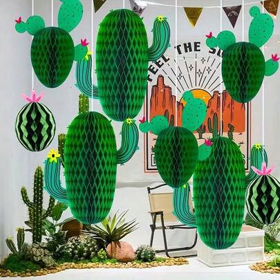1套/3件,绿色主题纸质仙人掌创意蜂窝球吊坠,非常适合生日派对主题套装 - 彩色 - 查看 7