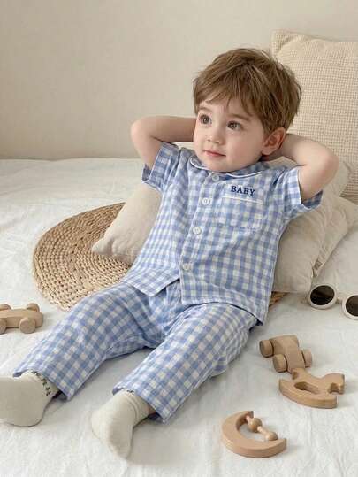5. 男婴复古格子开衫长裤套装(2件套),可爱彼得潘领,婴儿刺绣,休闲舒适家居服
