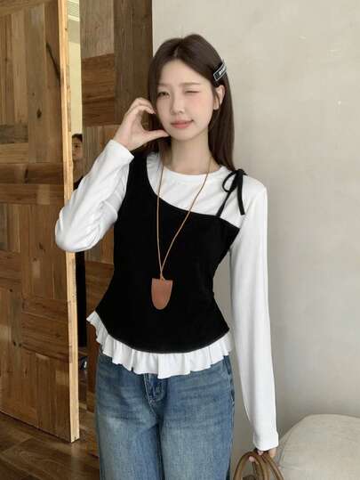二合一圆领荷叶边修身系腰长袖T恤打底衫 - 白色 - 查看 1