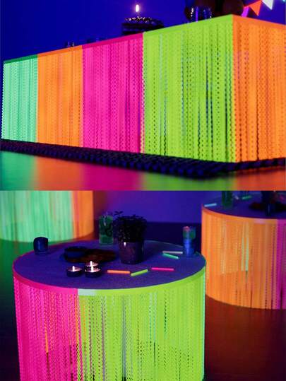 2包8件装夜光派对用品,荧光马卡龙波浪形金属箔流苏桌裙,霓虹紫外线反应背景幕帘彩带,适用于生日婚礼荧光派对装饰 - 查看 10