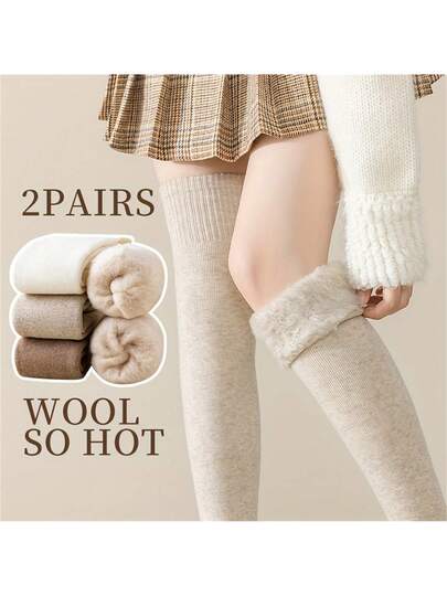 2双装秋冬过膝女袜,羊毛保暖内衬长袜,防冻保护,加厚保暖防寒过膝袜 - 彩色 - 查看 2